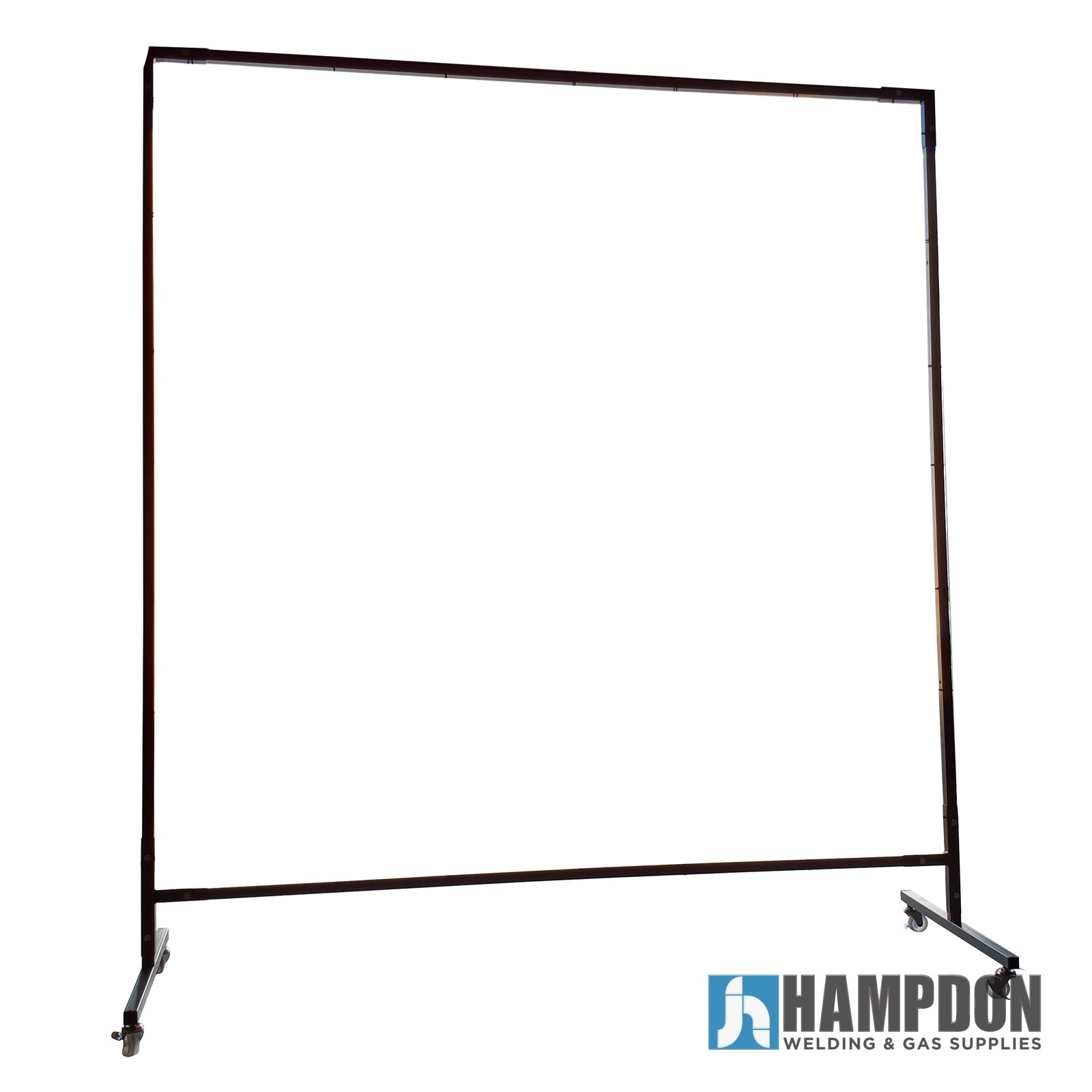 Sturdy welding curtain frame with 25mm x 25mm x 2.5mm heavy-duty square tube construction, black rust-resistant finish, and heavy-duty casters for easy mobility. Designed to fit 1.8m x 1.8m welding curtains (curtain not included), ensuring workplace safety from welding sparks and UV flashes.