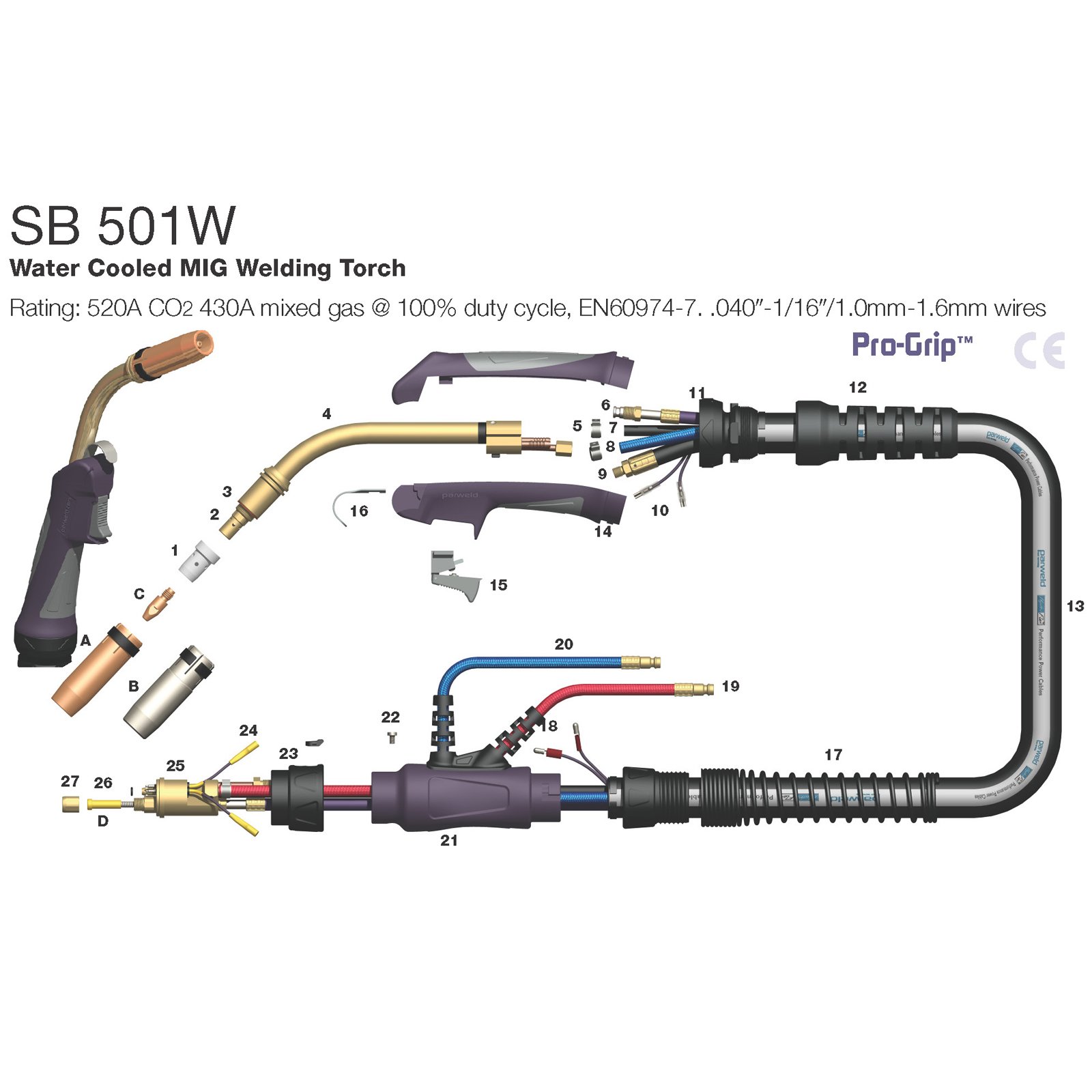 520 Amp 4 Meter Water Cooled MIG Gun / Torch – Binzel Style – Euro – MB501