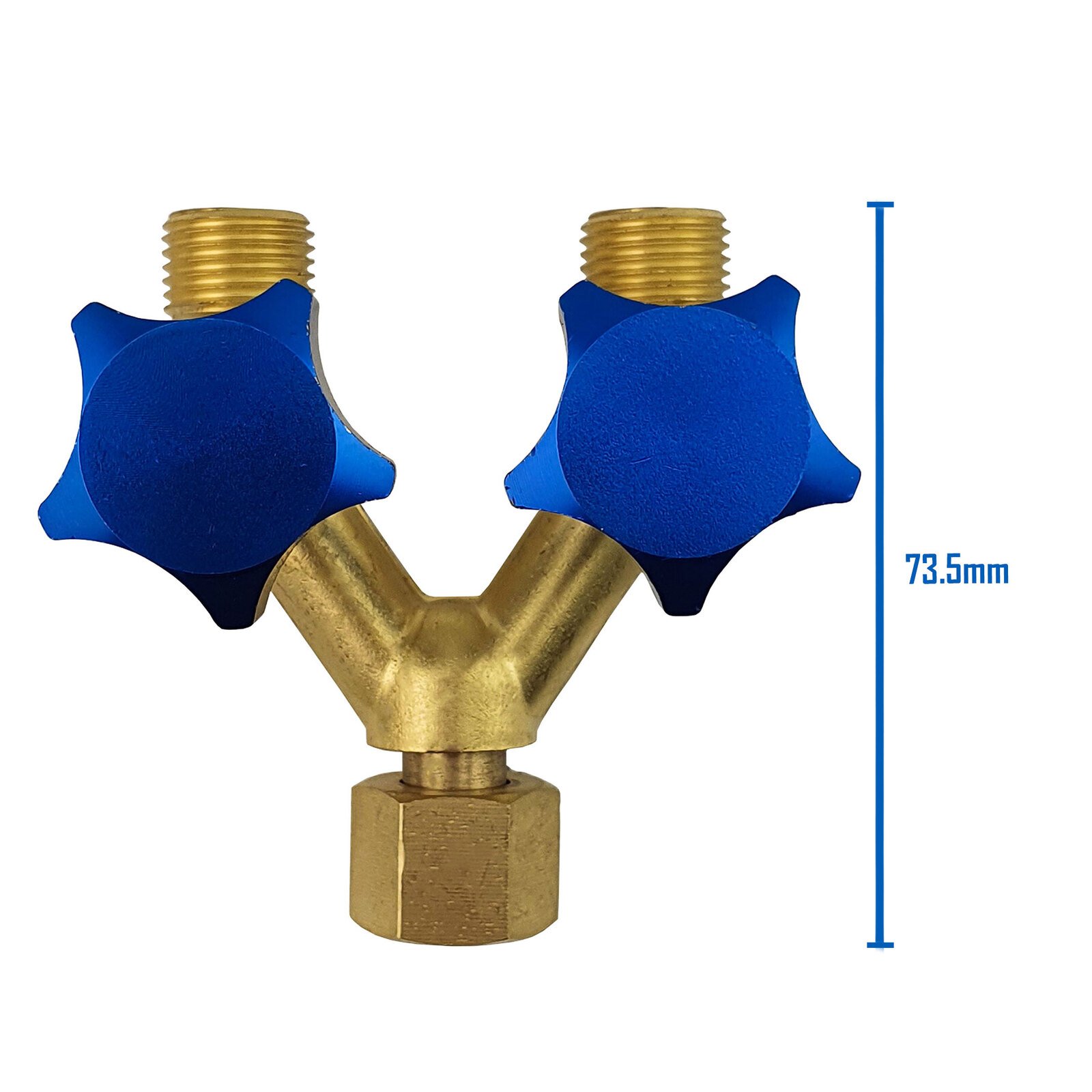 Hampdon Industrial R121 Argon Hose Y Piece with Valve Splitter Connector, crafted from high quality brass for industrial daily use, suitable for Argon, Co2 and other inert gas applications.