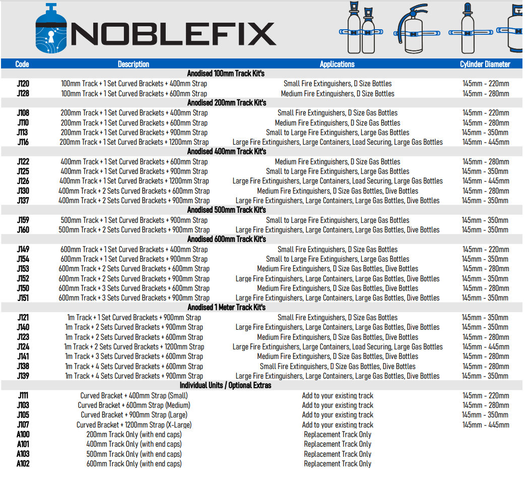 Australian-made NobleFix Gas Bottle Holder Restraint with 600mm track and 2x 600mm straps. Adjustable, durable, and versatile, ideal for small gas bottles, dive tanks, and D size cylinders. Conforms to Australian Standards, independently tested to withstand 380kg (3.5kN) pressure for enhanced OH&S practices.