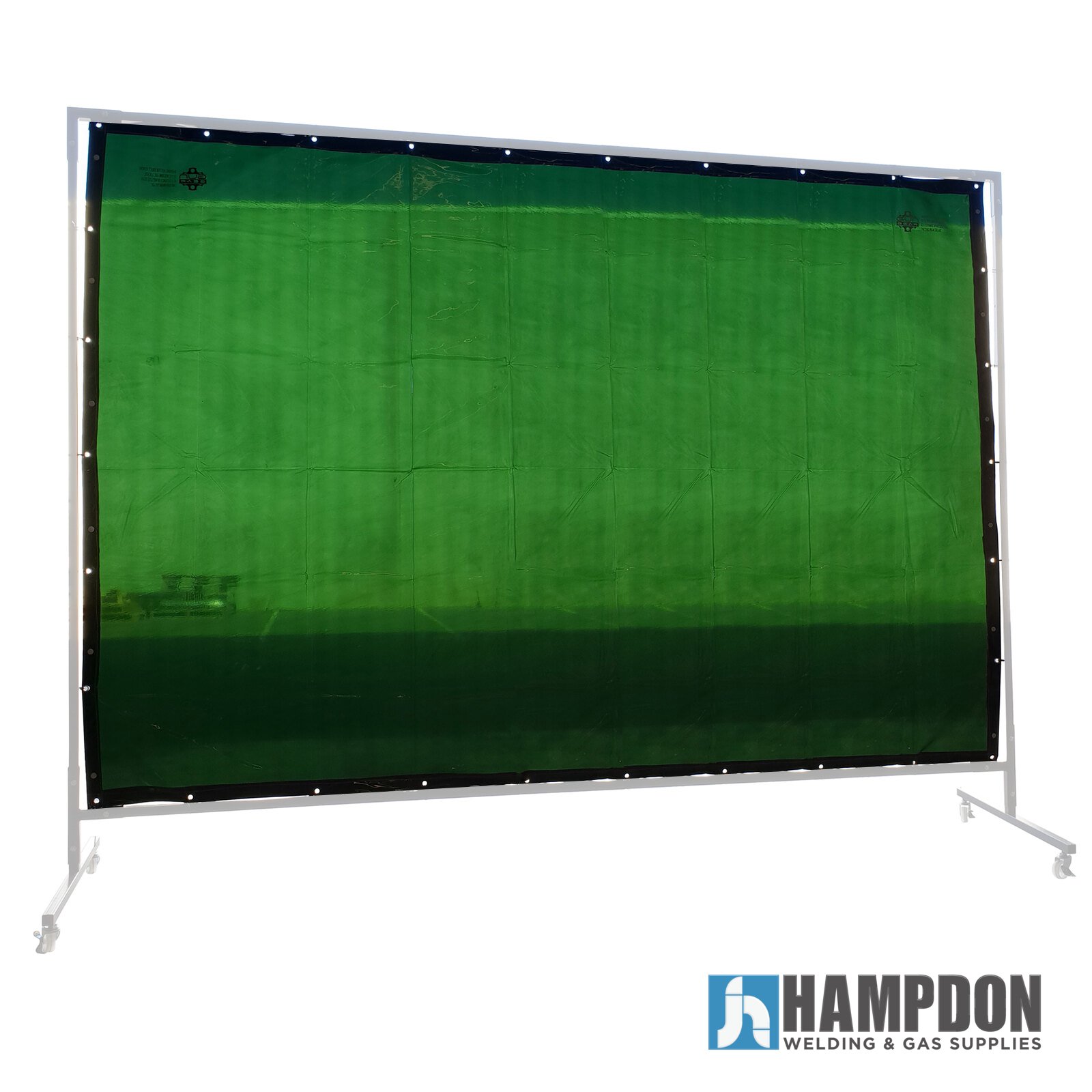 Green translucent welding screen with industrial quality, offering great protection against welding flashes. Features Kevlar stitched edging and press studs for continuous length setup. Screen only (frame sold separately).