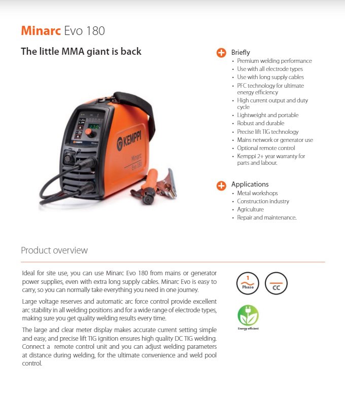 Designed for professional welders on the move, the Kemppi Minarc Evo 180 is a versatile DC welder supporting MMA, STICK, and TIG processes. Lightweight (5.4 kg) with an impact-resistant casing, it offers excellent arc stability, reliable ignition, and flexibility with mains or generator power, ideal for on-site use.